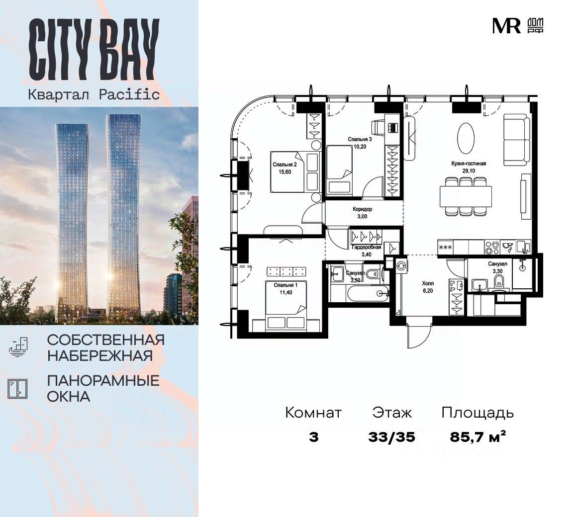 Продаётся 3-к квартира общей площадью 85.70 м² без отделки в ЖК City Вау, квартале Pacific, на 33-м этаже 35 этажного дома.
