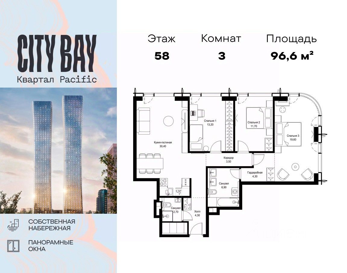 Продаётся 3-комнатная квартира общей площадью 96.60 м² без отделки в ЖК City Вау, квартале Pacific, на 58-м этаже 60 этажного дома.