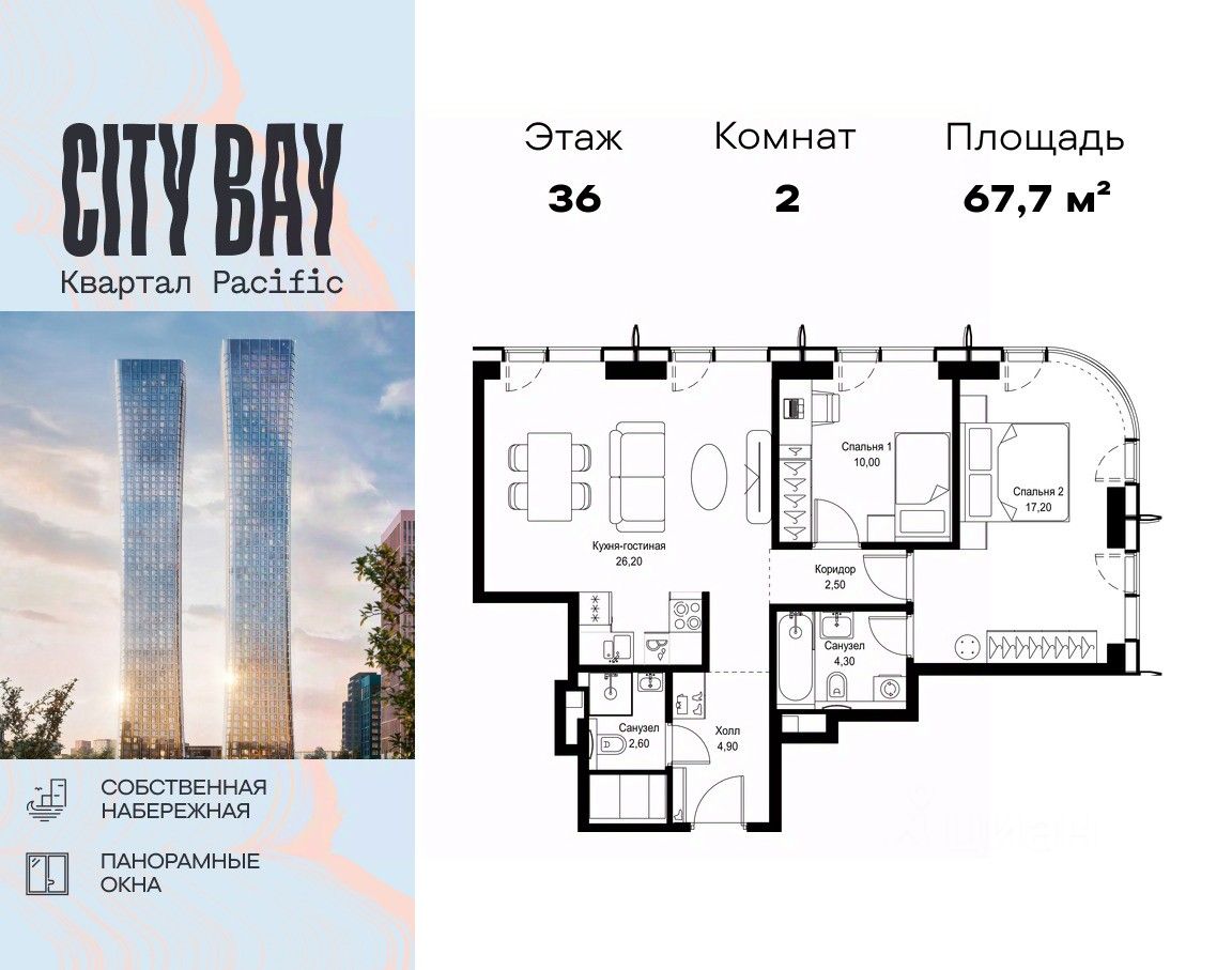 Продаётся 2-комнатная квартира общей площадью 67.70 м² без отделки в ЖК City Вау, квартале Pacific, на 36-м этаже 38 этажного дома.