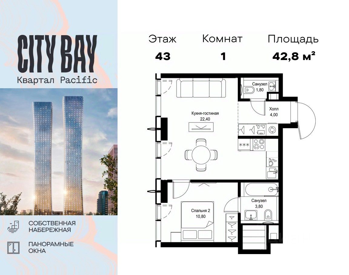 Продаётся 1-комнатная квартира общей площадью 42.80 м² без отделки в ЖК City Вау, квартале Pacific, на 43-м этаже 45 этажного дома.