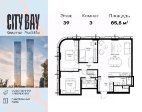 Продаётся 3-комнатная квартира общей площадью 85.80 м² без отделки в ЖК City Вау, квартале Pacific, на 39-м этаже 41 этажного дома.
