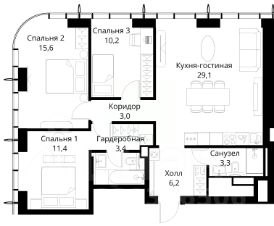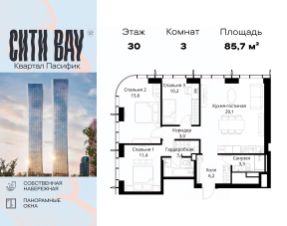 Продаётся 3-комнатная квартира общей площадью 85.70 м² без отделки в ЖК Сити Бэй, квартале Пасифик, на 30-м этаже 59 этажного дома.