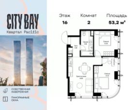 Продаётся 2-комнатная квартира общей площадью 53.20 м² без отделки в ЖК City Вау, квартале Pacific, на 16-м этаже 18 этажного дома.