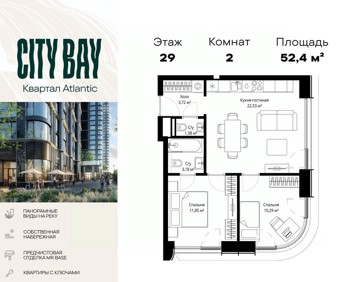 Продаётся 2-комнатная квартира общей площадью 52.40 м² с предчистовой отделкой в ЖК City Вау на 29-м этаже 53 этажного дома.