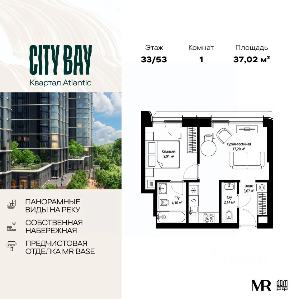 Продаётся 1-к квартира общей площадью 37.02 м² с предчистовой отделкой в ЖК City Вау на 33-м этаже 53 этажного дома.