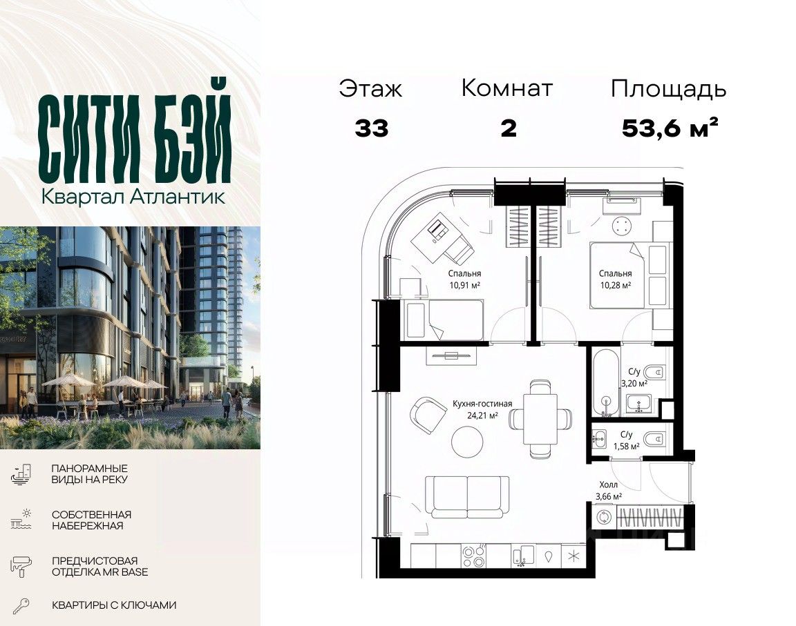 Продаётся 2-комнатная квартира общей площадью 53.60 м² с предчистовой отделкой в ЖК Сити Бэй на 33-м этаже 53 этажного дома.