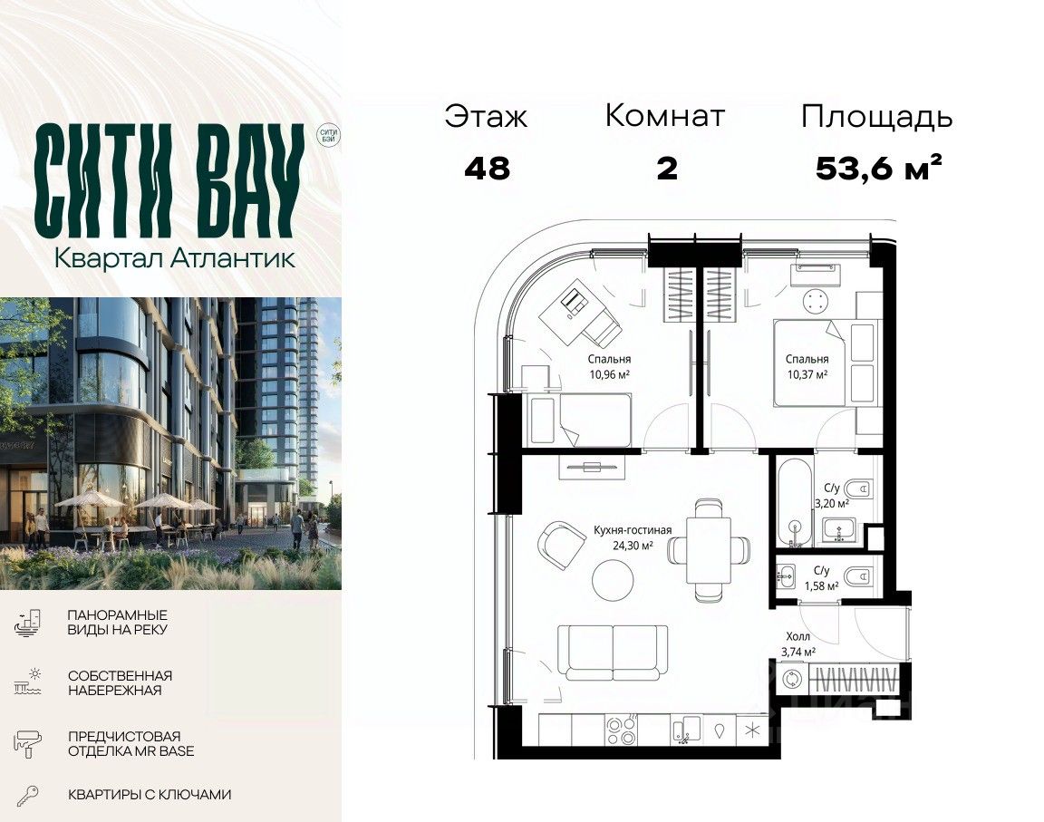 Продаётся 2-комнатная квартира общей площадью 53.60 м² с предчистовой отделкой в ЖК Сити Бэй на 48-м этаже 53 этажного дома.