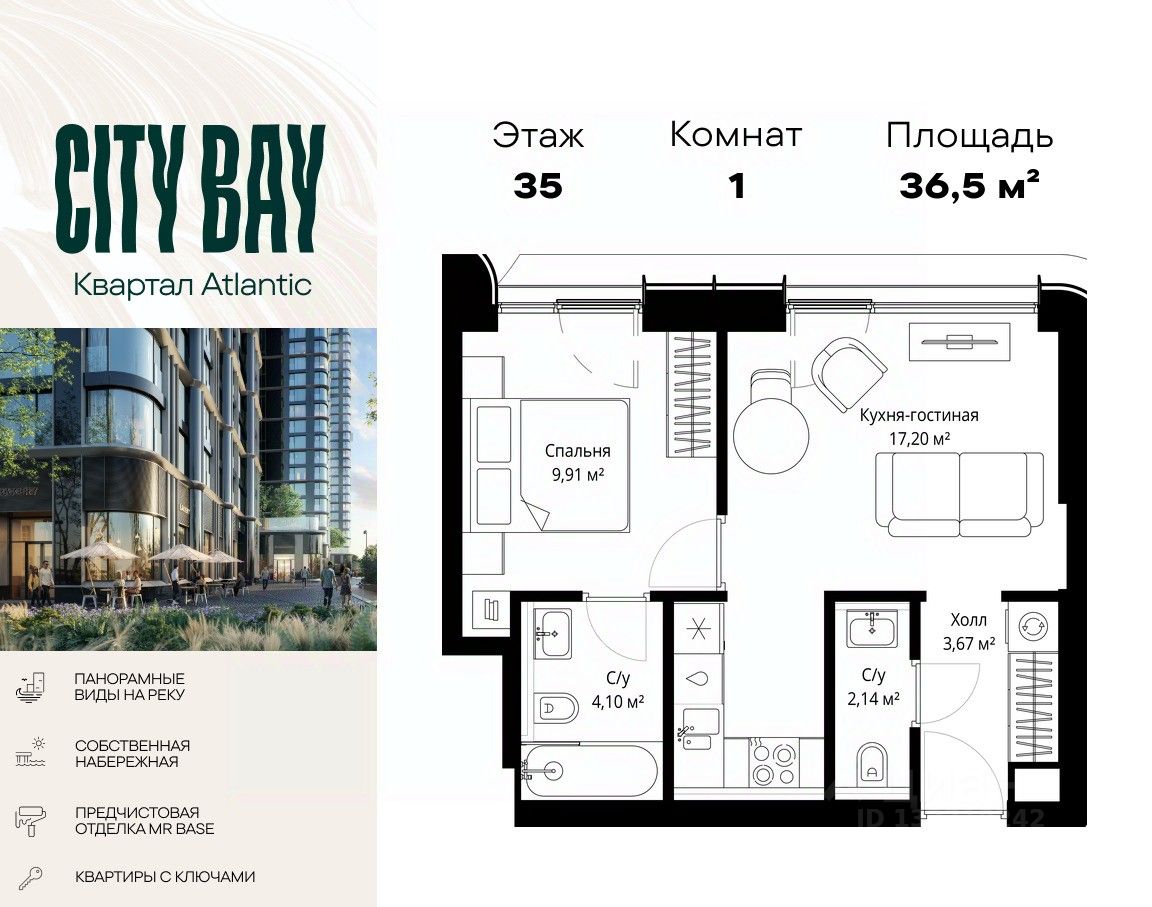 Продаётся 1-комнатная квартира общей площадью 36.50 м² с предчистовой отделкой в ЖК City Вау на 35-м этаже 53 этажного дома.
