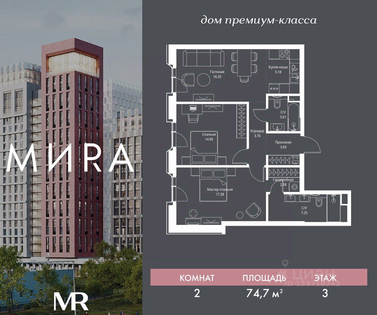 Продаётся 2-комнатная квартира общей площадью 74.70 м² без отделки в доме премиум-класса МИRА на 3-м этаже 23 этажного дома. Квартира расположена в корпусе 2.