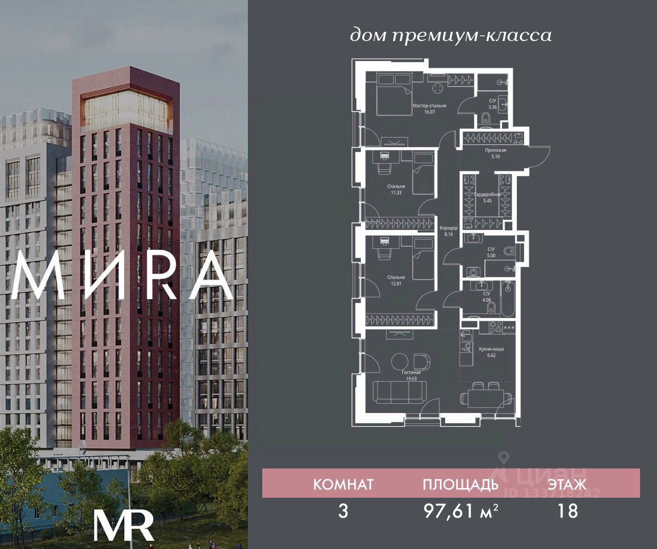 Продаётся 3-комнатная квартира общей площадью 97.61 м² без отделки в доме премиум-класса МИRА на 18-м этаже 23 этажного дома. Квартира расположена в корпусе 2.