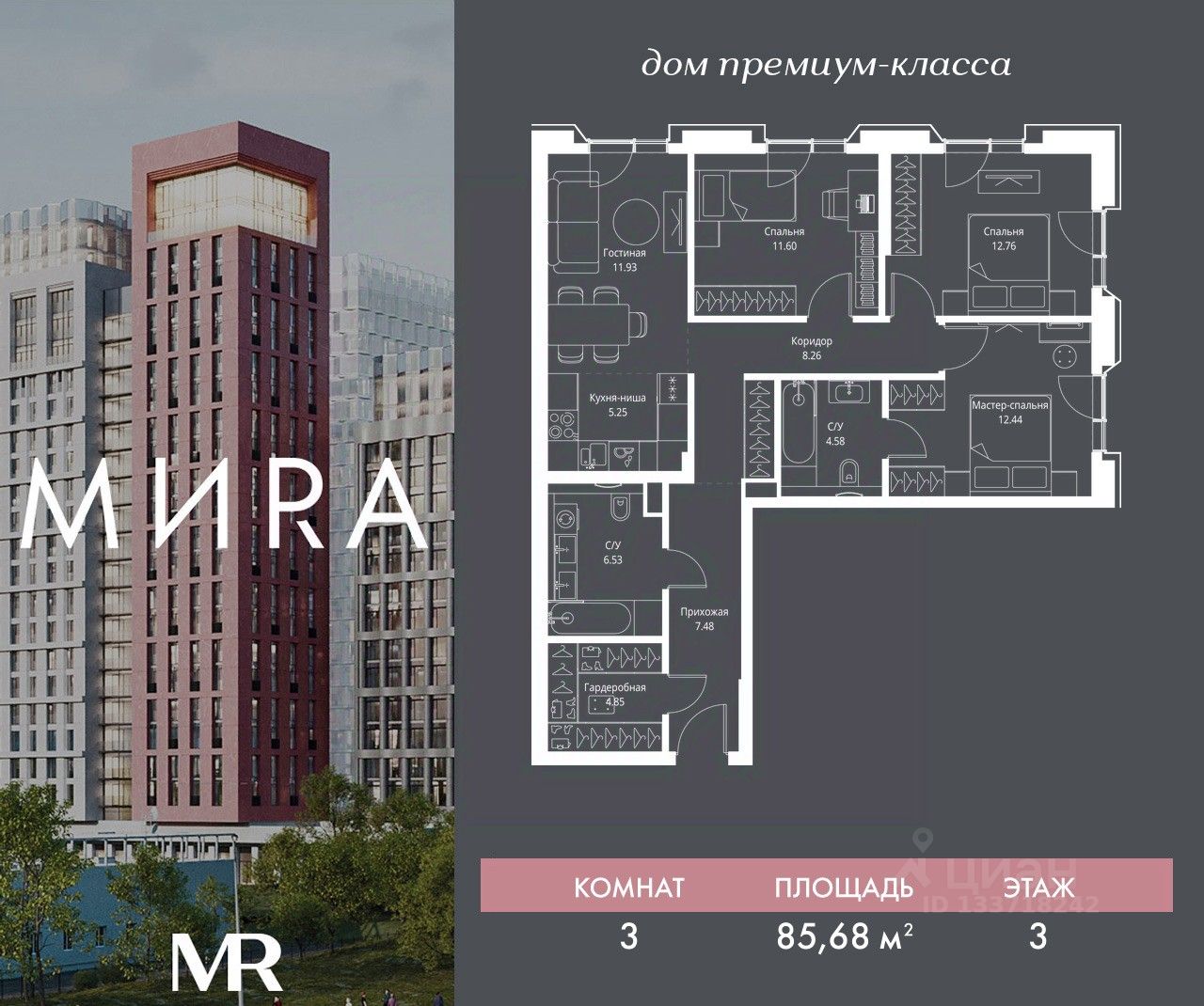 Продаётся 3-комнатная квартира общей площадью 85.68 м² без отделки в доме премиум-класса МИRА на 3-м этаже 23 этажного дома. Квартира расположена в корпусе 2.