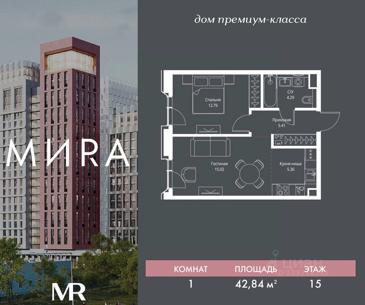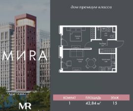 Продаётся 1-комнатная квартира общей площадью 42.84 м² без отделки в доме премиум-класса МИRА на 15-м этаже 23 этажного дома. Квартира расположена в корпусе 2.