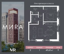 Продаётся 1-к квартира общей площадью 49.63 м² без отделки в доме премиум-класса МИRА на 9-м этаже 23 этажного дома. Квартира расположена в корпусе 2.