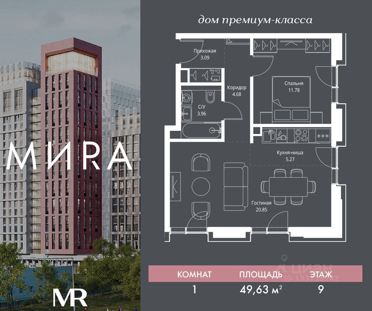 Продаётся 1-комнатная квартира общей площадью 49.63 м² без отделки в доме премиум-класса МИRА на 9-м этаже 23 этажного дома. Квартира расположена в корпусе 2.