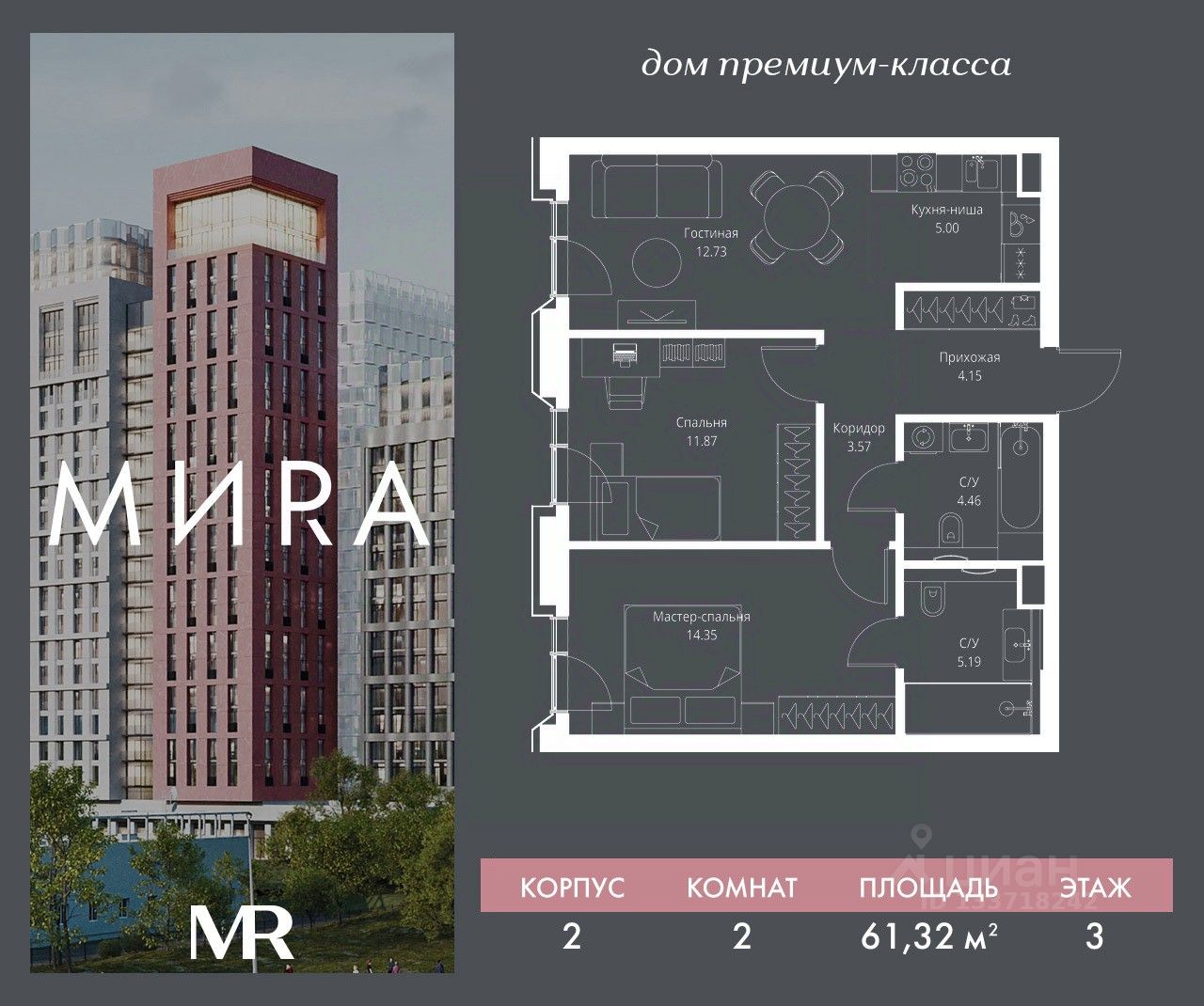 Продаётся 2-к квартира общей площадью 61.32 м² без отделки в доме премиум-класса МИRА на 3-м этаже 23 этажного дома. Квартира расположена в корпусе 2.