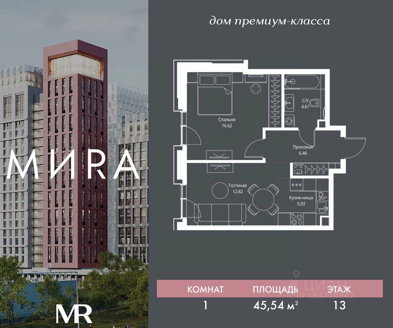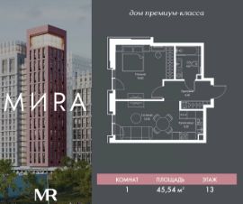 Продаётся 1-комнатная квартира общей площадью 45.54 м² без отделки в доме премиум-класса МИRА на 13-м этаже 23 этажного дома. Квартира расположена в корпусе 2.