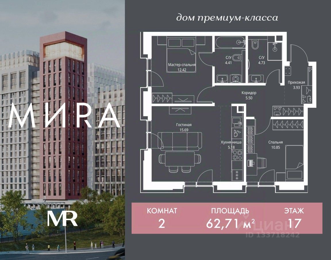 Продаётся 2-комнатная квартира общей площадью 62.71 м² без отделки в доме премиум-класса МИRА на 17-м этаже 23 этажного дома. Квартира расположена в корпусе 2.