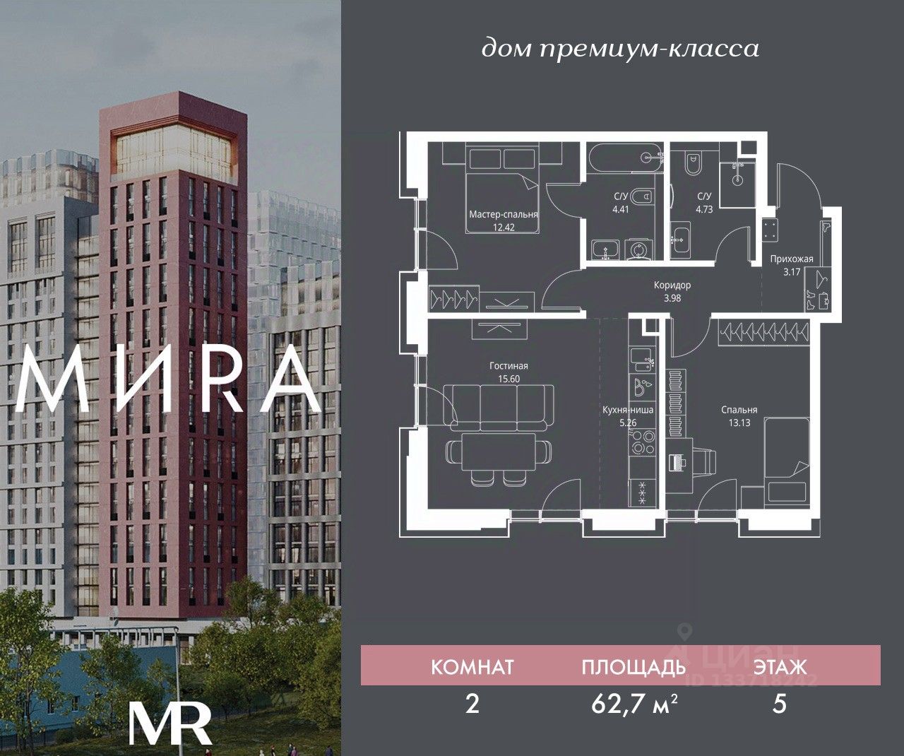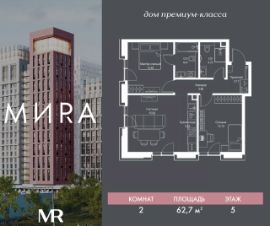 Продаётся 2-комнатная квартира общей площадью 62.70 м² без отделки в доме премиум-класса МИRА на 5-м этаже 23 этажного дома. Квартира расположена в корпусе 2.