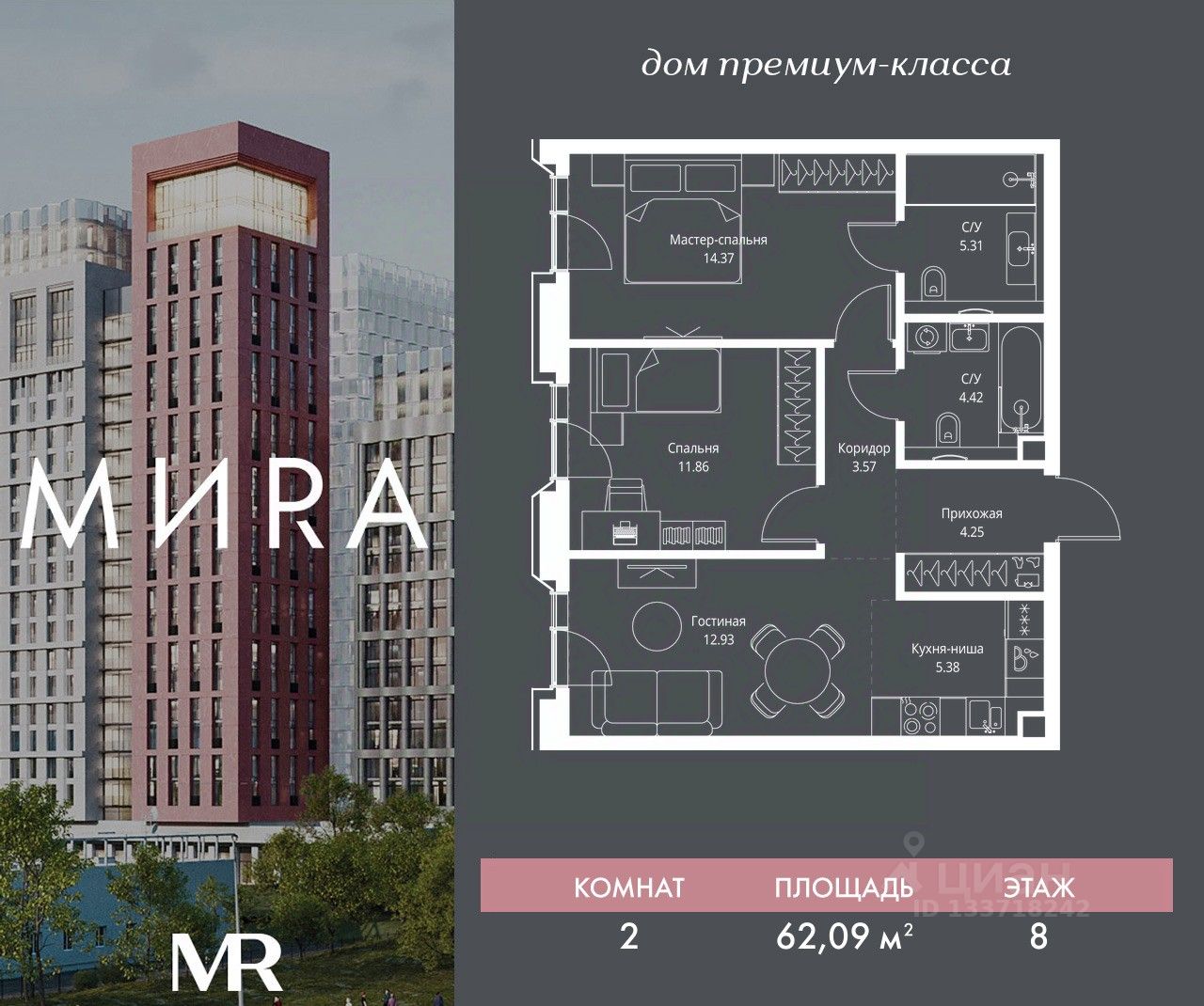 Продаётся 2-комнатная квартира общей площадью 62.09 м² без отделки в доме премиум-класса МИRА на 8-м этаже 23 этажного дома. Квартира расположена в корпусе 2.
