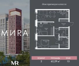 Продаётся 2-комнатная квартира общей площадью 62.29 м² без отделки в доме премиум-класса МИRА на 15-м этаже 23 этажного дома. Квартира расположена в корпусе 2.