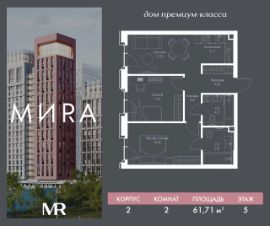 Продаётся 2-к квартира общей площадью 61.71 м² без отделки в доме премиум-класса МИRА на 5-м этаже 23 этажного дома. Квартира расположена в корпусе 2.