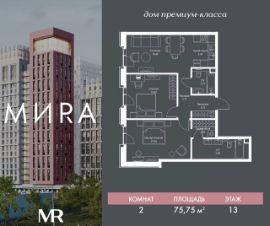 Продаётся 2-комнатная квартира общей площадью 75.75 м² без отделки в доме премиум-класса МИRА на 13-м этаже 23 этажного дома. Квартира расположена в корпусе 2.