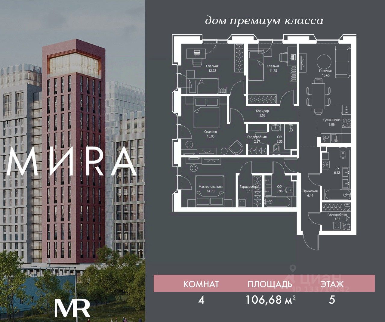Продаётся 4-комнатная квартира общей площадью 106.68 м² без отделки в доме премиум-класса МИRА на 5-м этаже 23 этажного дома. Квартира расположена в корпусе 2.