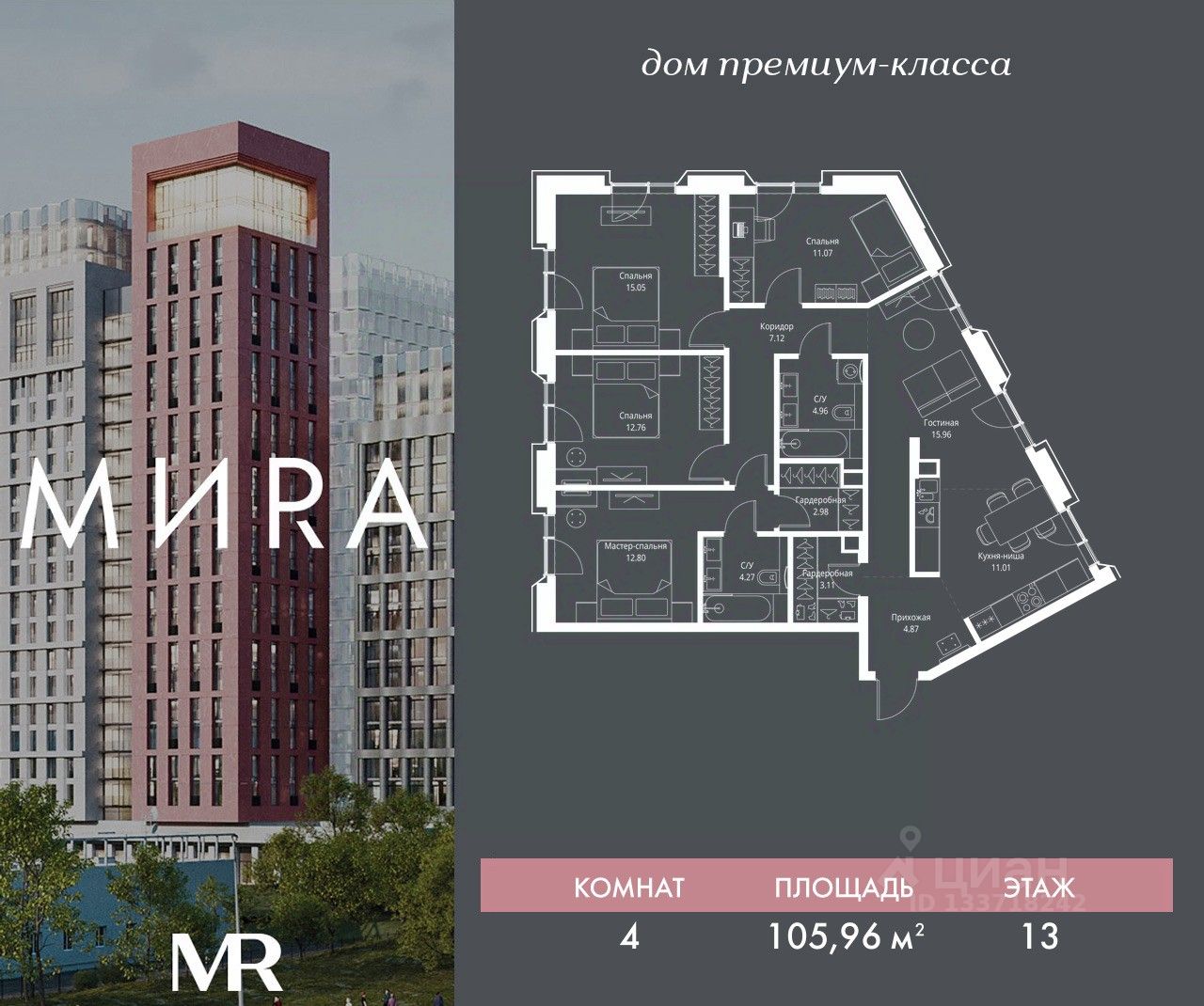 Продаётся 4-комнатная квартира общей площадью 105.96 м² без отделки в доме премиум-класса МИRА на 13-м этаже 23 этажного дома. Квартира расположена в корпусе 2.