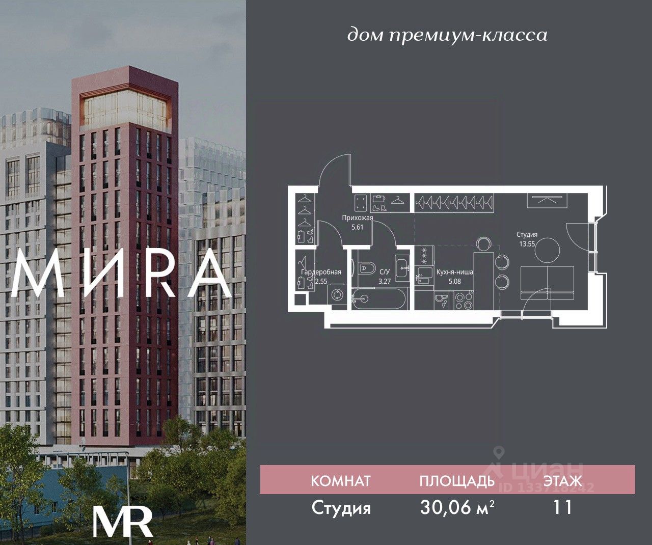 Продаётся студия общей площадью 30.06 м² без отделки в доме премиум-класса МИRА на 11-м этаже 23 этажного дома. Квартира расположена в корпусе 2.