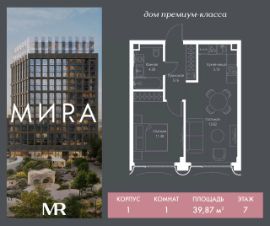 Продаётся 1-к квартира общей площадью 39.87 м² без отделки в доме премиум-класса МИRА на 7-м этаже 17 этажного дома. Квартира расположена в корпусе 1.