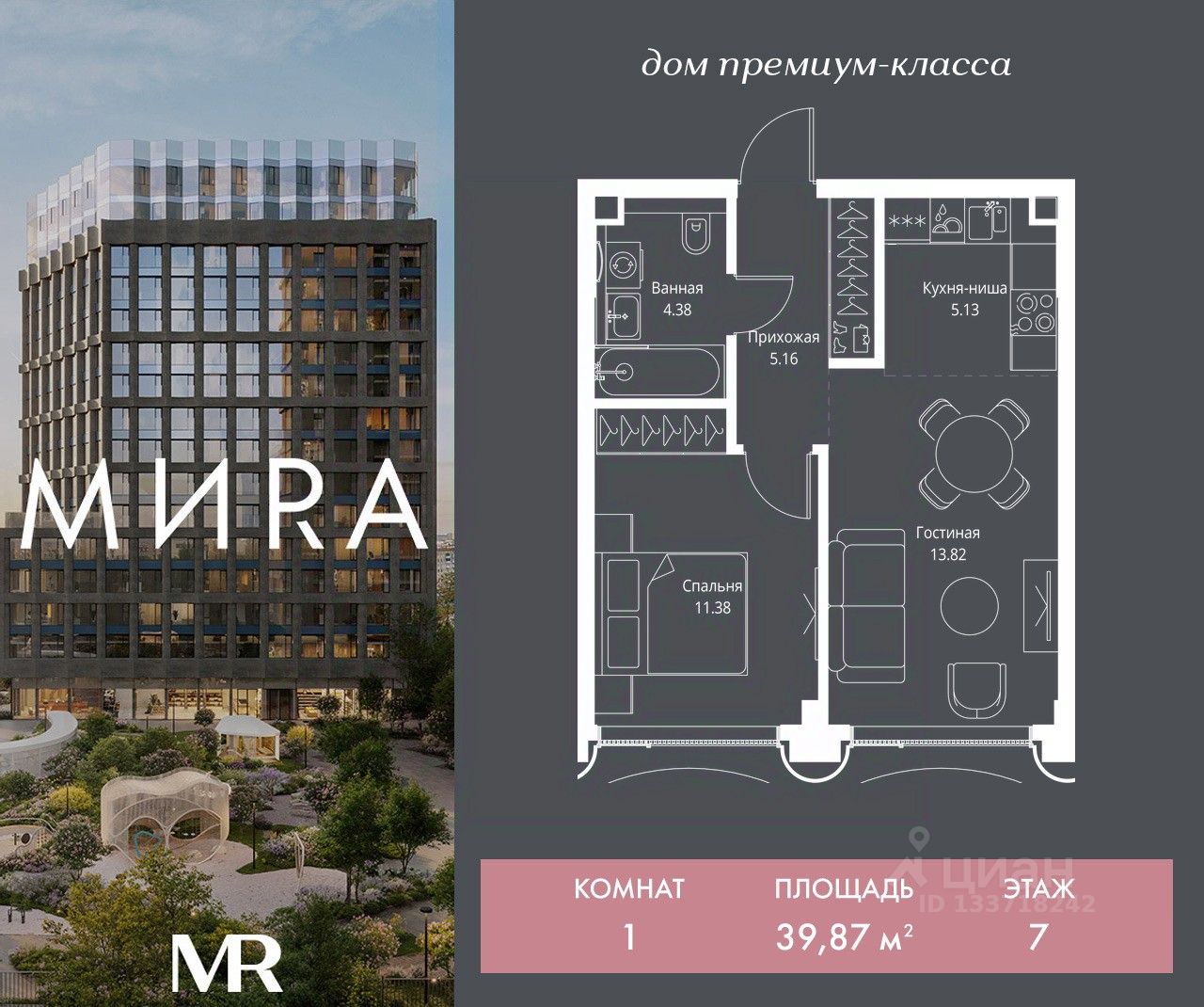 Продаётся 1-комнатная квартира общей площадью 39.87 м² без отделки в доме премиум-класса МИRА на 7-м этаже 17 этажного дома. Квартира расположена в корпусе 1.