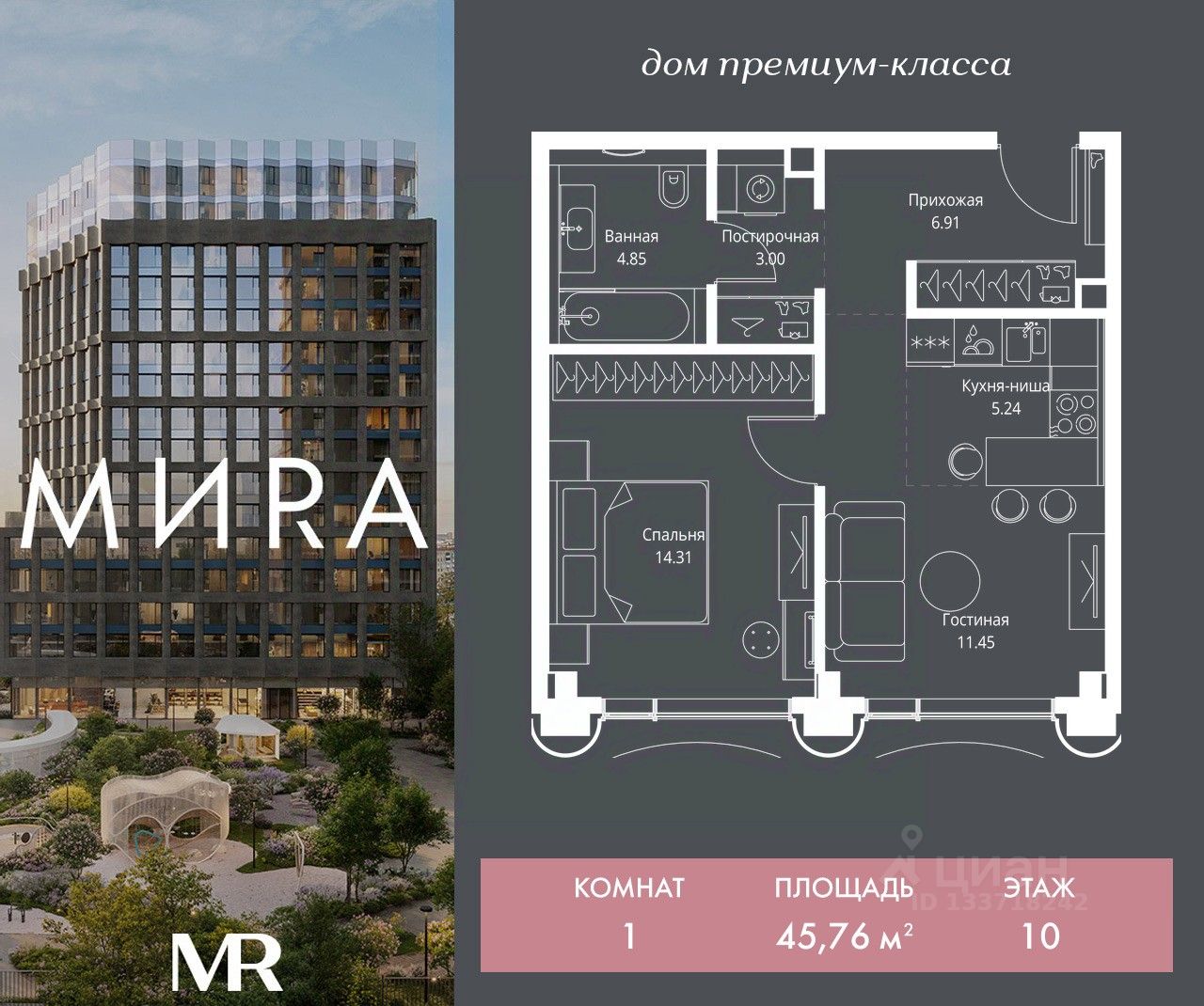 Продаётся 1-комнатная квартира общей площадью 45.76 м² без отделки в доме премиум-класса МИRА на 10-м этаже 17 этажного дома. Квартира расположена в корпусе 1.