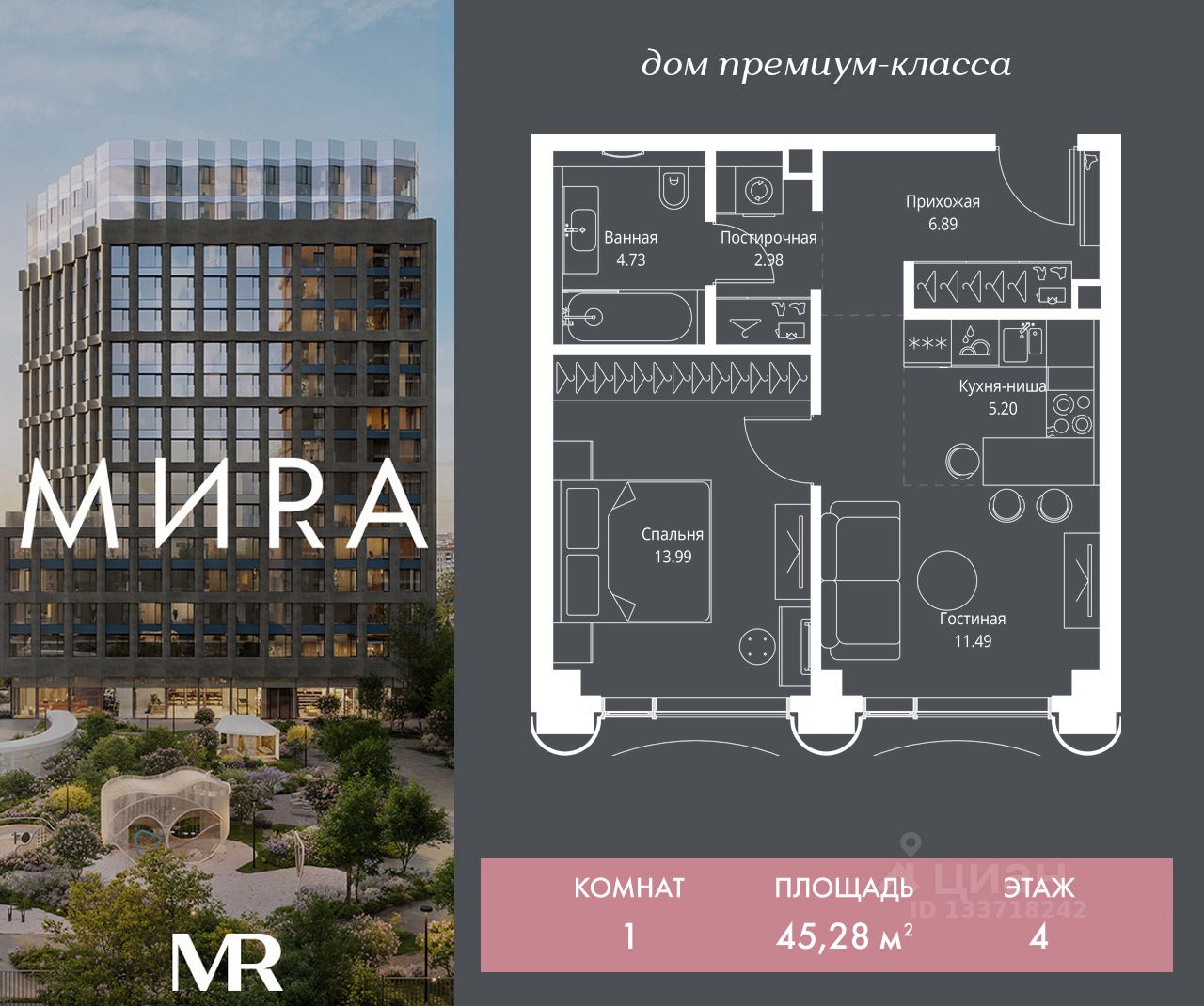 Продаётся 1-комнатная квартира общей площадью 45.28 м² без отделки в доме премиум-класса МИRА на 4-м этаже 17 этажного дома. Квартира расположена в корпусе 1.