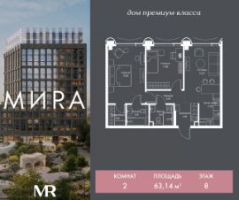 Продаётся 2-комнатная квартира общей площадью 63.14 м² без отделки в доме премиум-класса МИRА на 8-м этаже 17 этажного дома. Квартира расположена в корпусе 1.