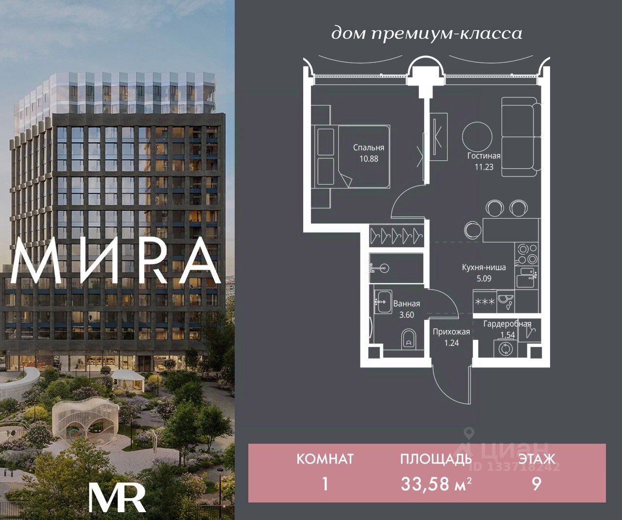 Продаётся 1-комнатная квартира общей площадью 33.58 м² без отделки в доме премиум-класса МИRА на 9-м этаже 17 этажного дома. Квартира расположена в корпусе 1.