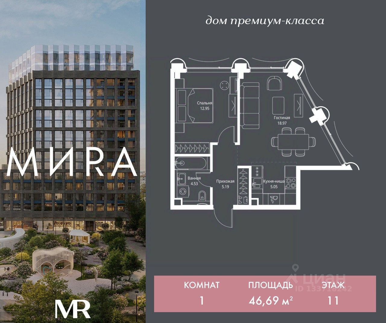 Продаётся 1-комнатная квартира общей площадью 46.69 м² без отделки в доме премиум-класса МИRА на 11-м этаже 17 этажного дома. Квартира расположена в корпусе 1.