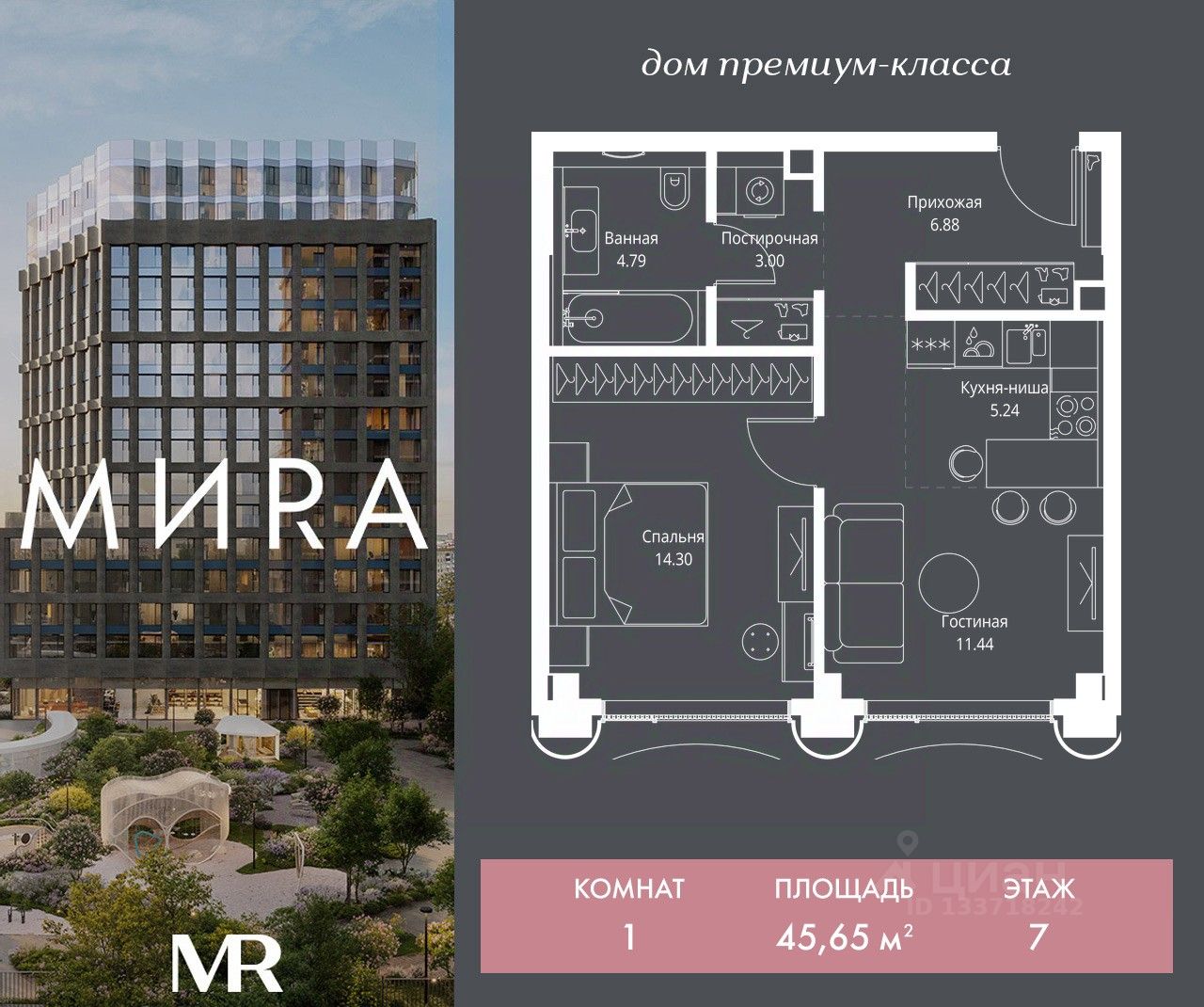 Продаётся 1-комнатная квартира общей площадью 45.65 м² без отделки в доме премиум-класса МИRА на 7-м этаже 17 этажного дома. Квартира расположена в корпусе 1.