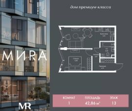 Продаётся 1-комнатная квартира общей площадью 42.86 м² без отделки в доме премиум-класса МИRА на 13-м этаже 24 этажного дома. Квартира расположена в корпусе 3.