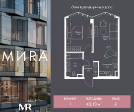 Продаётся 1-комнатная квартира общей площадью 43.13 м² без отделки в доме премиум-класса МИRА на 2-м этаже 24 этажного дома. Квартира расположена в корпусе 3.