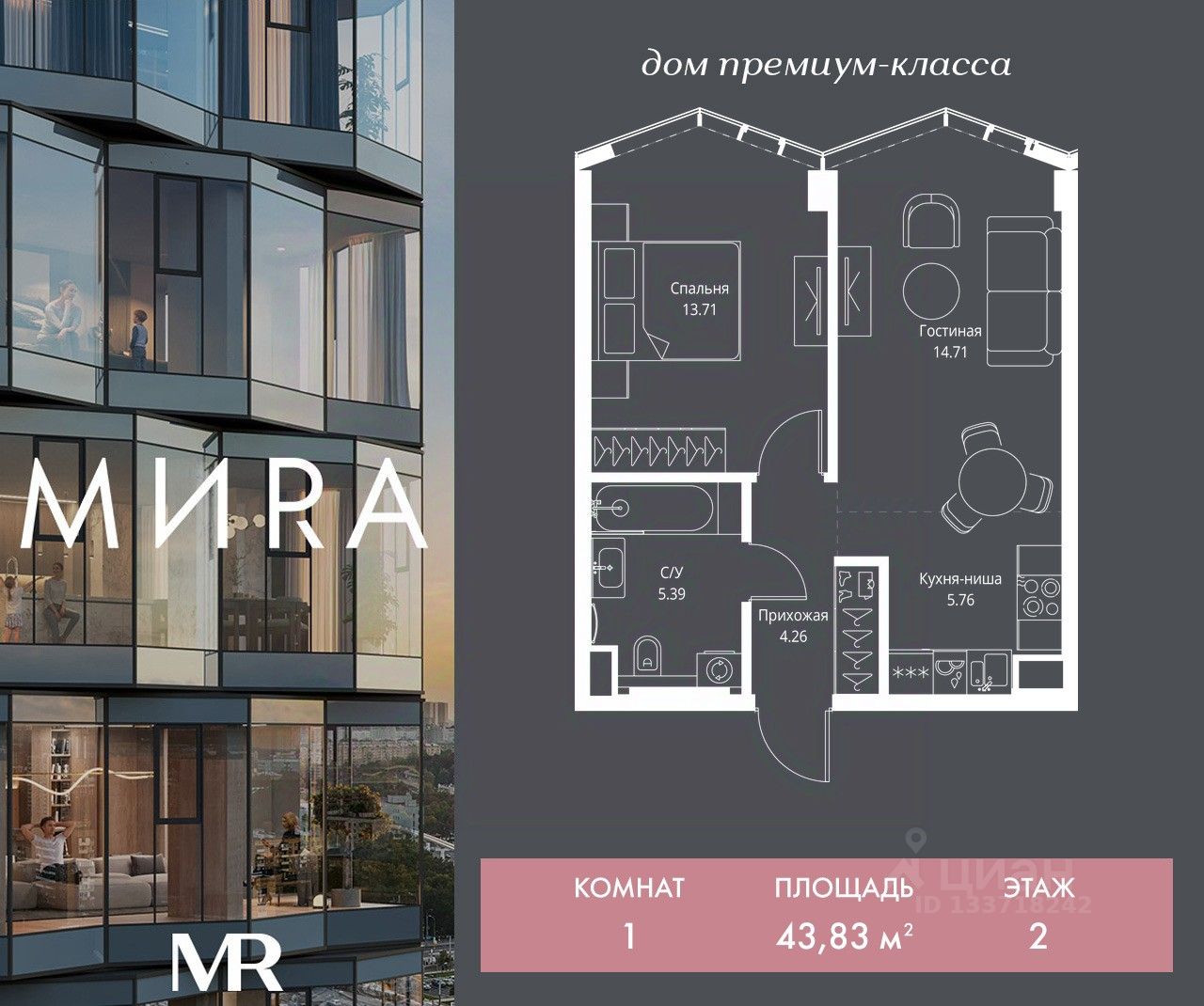 Продаётся 1-комнатная квартира общей площадью 43.83 м² без отделки в доме премиум-класса МИRА на 2-м этаже 24 этажного дома. Квартира расположена в корпусе 3.