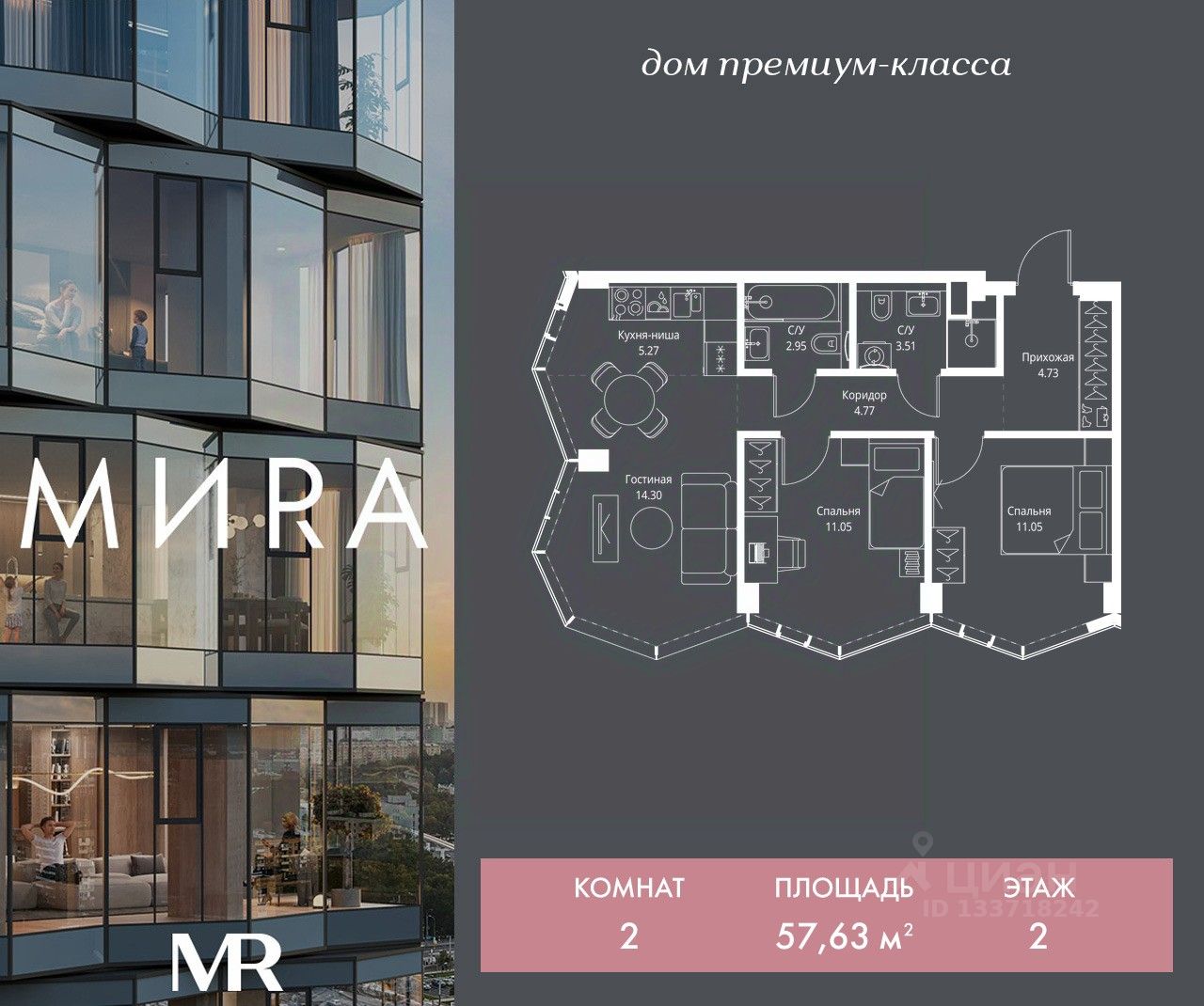 Продаётся 2-комнатная квартира общей площадью 57.63 м² без отделки в доме премиум-класса МИRА на 2-м этаже 24 этажного дома. Квартира расположена в корпусе 3.
