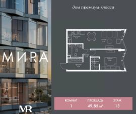 Продаётся 1-комнатная квартира общей площадью 49.85 м² без отделки в доме премиум-класса МИRА на 13-м этаже 24 этажного дома. Квартира расположена в корпусе 3.