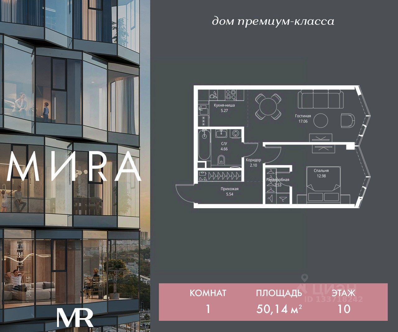 Продаётся 1-комнатная квартира общей площадью 50.14 м² без отделки в доме премиум-класса МИRА на 10-м этаже 24 этажного дома. Квартира расположена в корпусе 3.
