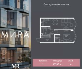 Продаётся 1-комнатная квартира общей площадью 49.55 м² без отделки в доме премиум-класса МИRА на 4-м этаже 24 этажного дома. Квартира расположена в корпусе 3.