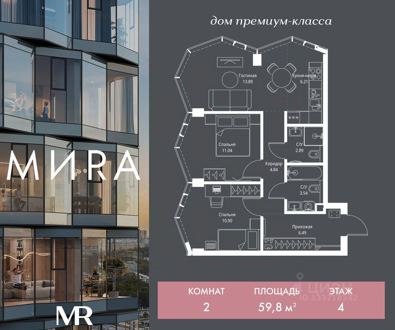 Продаётся 2-комнатная квартира общей площадью 59.80 м² без отделки в доме премиум-класса МИRА на 4-м этаже 24 этажного дома. Квартира расположена в корпусе 3.