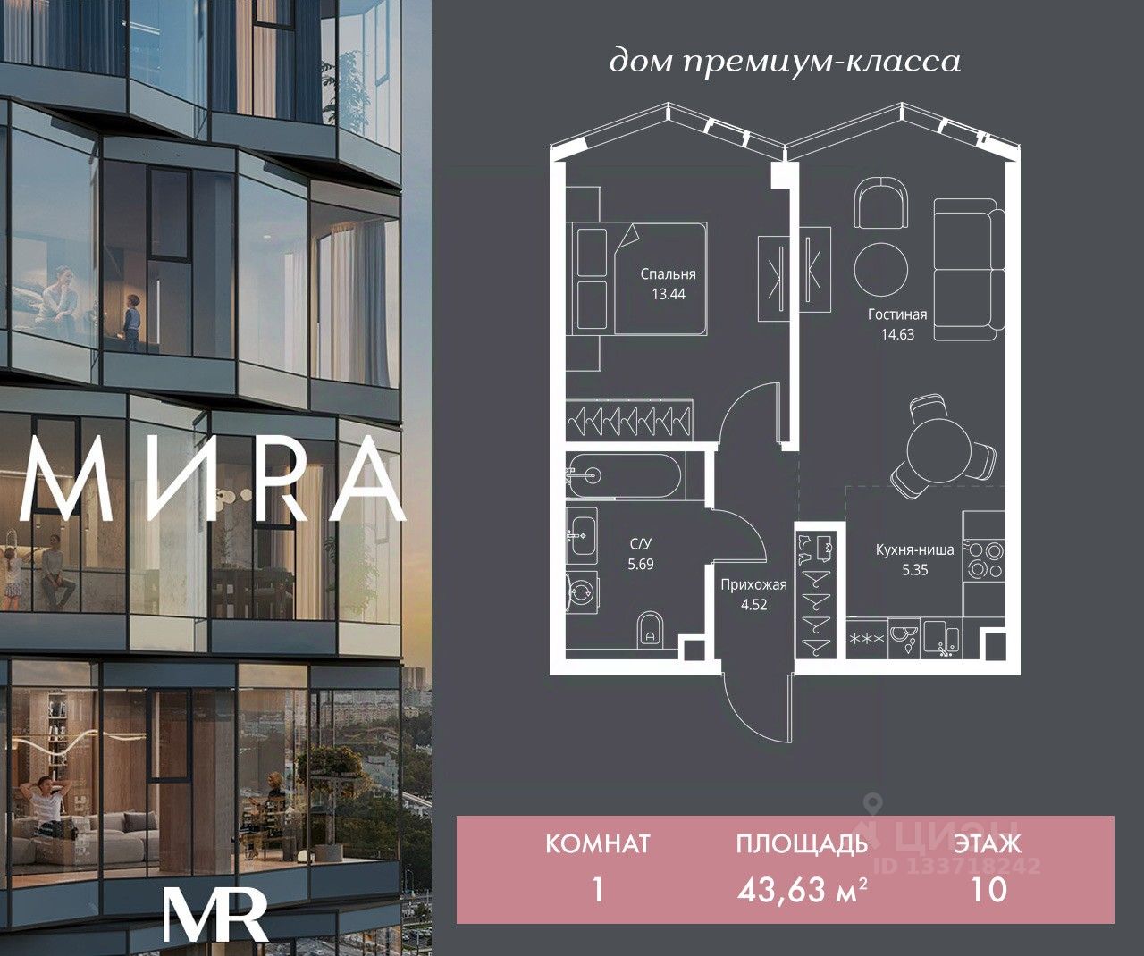 Продаётся 1-комнатная квартира общей площадью 43.63 м² без отделки в доме премиум-класса МИRА на 10-м этаже 24 этажного дома. Квартира расположена в корпусе 3.