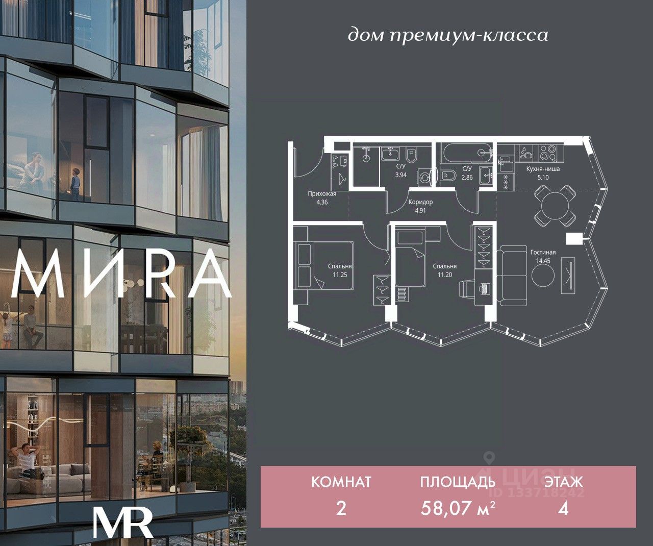 Продаётся 2-комнатная квартира общей площадью 58.07 м² без отделки в доме премиум-класса МИRА на 4-м этаже 24 этажного дома. Квартира расположена в корпусе 3.