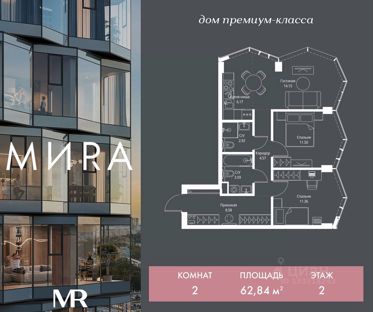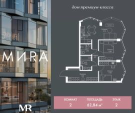 Продаётся 2-комнатная квартира общей площадью 62.84 м² без отделки в доме премиум-класса МИRА на 2-м этаже 24 этажного дома. Квартира расположена в корпусе 3.
