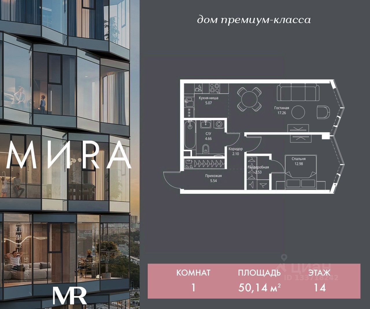 Продаётся 1-комнатная квартира общей площадью 50.14 м² без отделки в доме премиум-класса МИRА на 14-м этаже 24 этажного дома. Квартира расположена в корпусе 3.