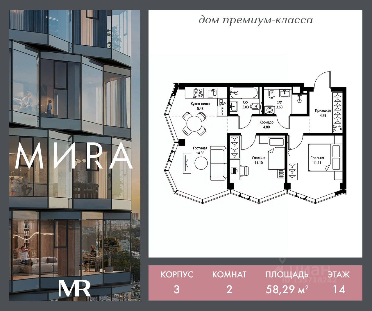 Продаётся 2-к квартира общей площадью 58.29 м²без отделки в доме премиум-класса МИRА на 14-м этаже 24 этажного дома. Квартира расположена в корпусе 3.